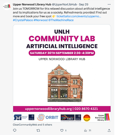 From October 2022 to October 2023, the Upper Norwood Library Hub (UNLH) collaborated with the Responsible Technology Institute (RTI) at University of Oxford and ORBIT RRI Limited to deliver a pilot community lab exploring applications of Artificial Intelligence (AI) as they may affect society and the local community.
