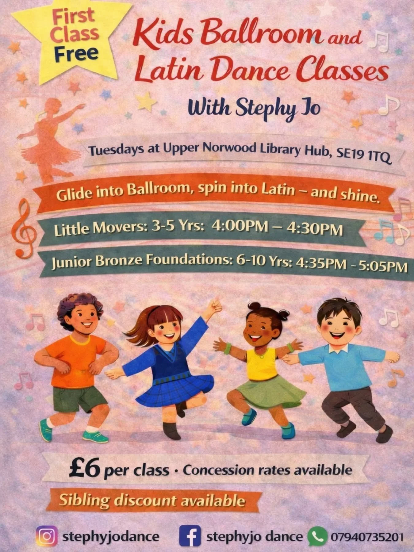 £6 per class, concession rates and sibling discounts available.
